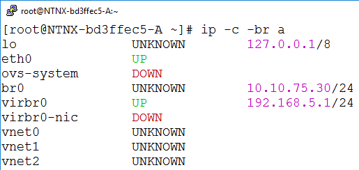 也可以在AHV執行「ip a」或是「ip -c -br a」指令,查看AHV Hypervisor使用的IP位址資訊,可以看到「br0」介面,使用剛才安裝程序中組態設定的「10.10.75.30」位址,而與CVM溝通的「virbr0」介面,則是使用系統預設的「192.168.5.1」位址,如圖14所示,這也是一開始提醒管理人員切勿使用192.168.5.0/24系統預設網段的原因。