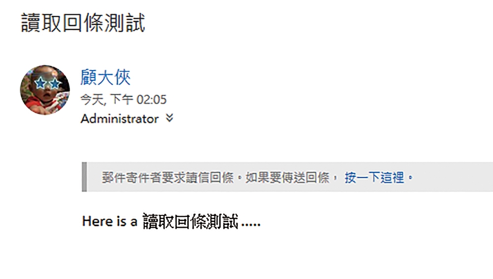 圖16所示便是一封要求讀信回條的Email範例。在還沒有啟用自動回應讀信回條的功能之前,頁面中會出現提示傳送讀取回條的超連結,一旦點選該連結,則收件者將會收到讀取郵件的時間回應。