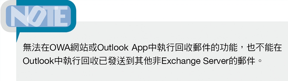 此時,或許會想使用前面介紹過的回收郵件功能趕緊將錯發的郵件刪除,但是如果收件者剛好就在操作Outlook期間,錯發的郵件可能早在第一時間就被開啟過,因此想要回收已經是不可能。