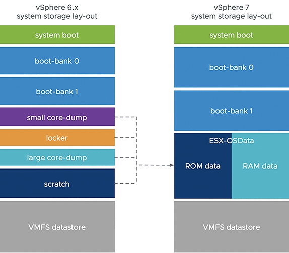 圖7 舊版ESXi 6.x和新版ESXi 7系統分割區差異示意圖。 (圖片來源:VMware vSphere Blog - vSphere 7 - ESXi System Storage Changes)