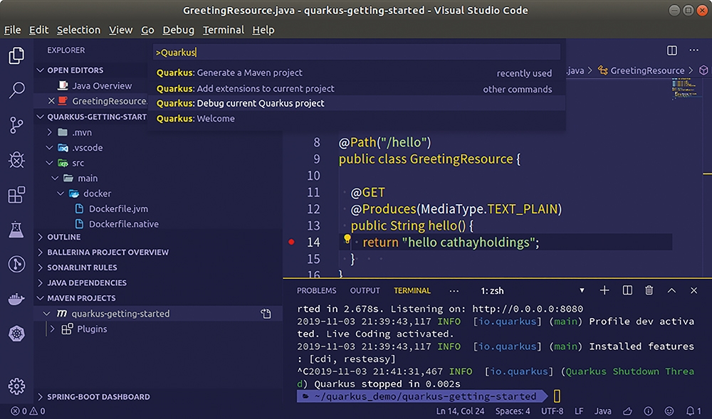 接下來,開啟「GreetingResource.java」檔案,插入Debug中斷點,按下〔F1〕,一樣輸入「quarkus」,選擇「Quarkus: Debug current Quarkus project」。