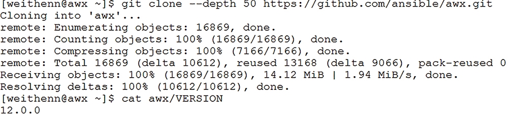 現在可以執行「git clone --depth 50 https://github.com/ansible/awx.git」指令,從Github下載Ansible AWX專案。完成下載作業之後,查看「awx/VERSION」檔案內容,就會看到稍後部署的Ansible AWX版本是2020年6月最新釋出的「12.0.0」版本,如圖12所示。
