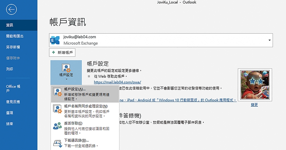 在開始介紹如何從Exchange Server 2019伺服端做好信箱的備份與還原之前,先學習一般用戶如何在自己電腦的Outlook中自行做好重要電子郵件的備份與還原。這部分的操作,所有用戶和各部門的窗口人員務必完成教育訓練。以Outlook 2016/2019介面為例,先在「帳戶設定」圖示選單中點選「帳戶設定」選項(圖1)。