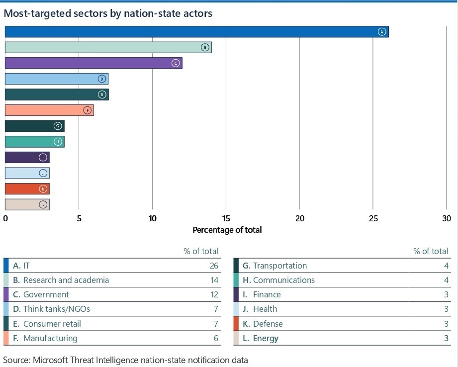 雖然從數量上來看,網路罪犯仍是最大的資安威脅,但國家/地區級行為者(nation-state actors)依然鎖定關鍵產業與地區發動攻擊,其背後原因除了間諜活動之外,部分也與追求財務利益有關。地緣政治目標仍是推動國家資助網路行動激增的主要原因,特別是對通訊、科學研究與學術領域的攻擊範圍有顯著擴大的趨勢。