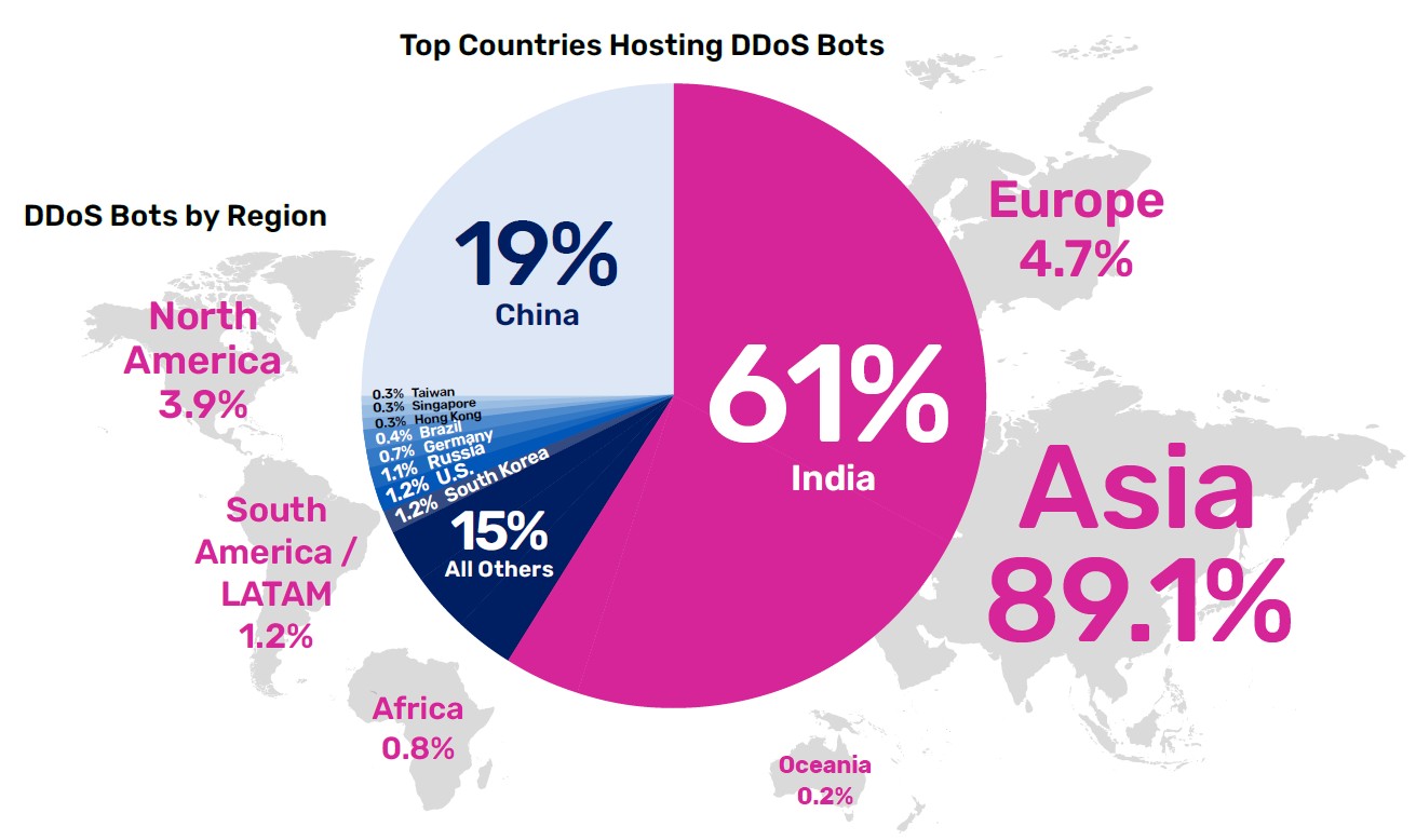 90%的殭屍程式都託管在亞洲,其中以中國和印度為首。亞洲國家是Mirai和其他殭屍網路的重點攻擊目標,旨在擴大其攻擊生態系統。中國和印度合計託管了全球80%的殭屍程式。這兩個國家對網路犯罪分子尤其具有吸引力,因為它們人口眾多,並且具有以下特點: