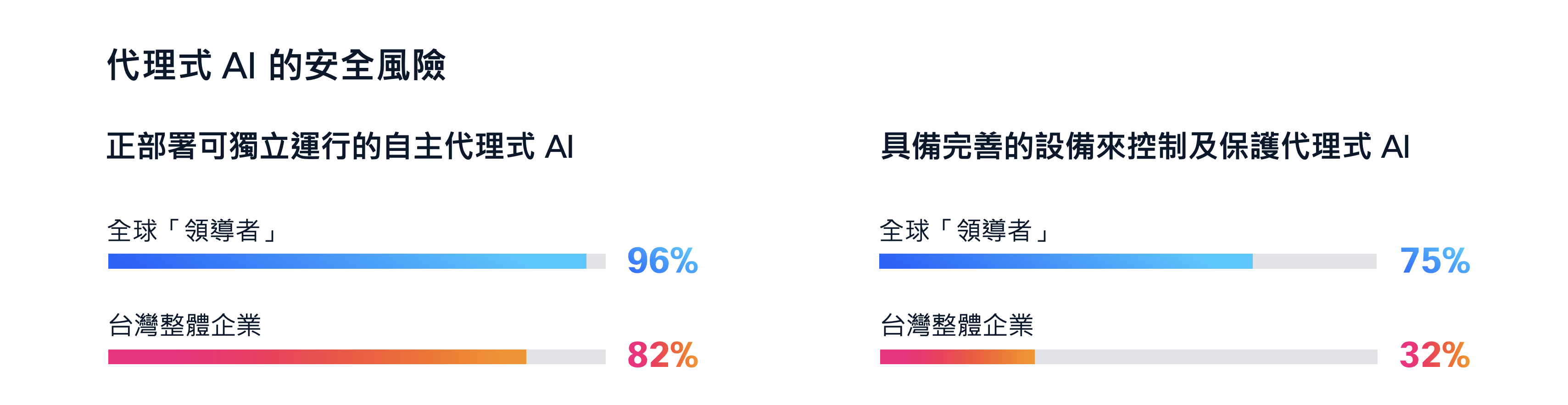領導者自始就將安全納入架構設計。84%全球領導者採用端到端加密並進行持續監控(台灣整體企業數字僅為21%)。對代理式AI而言,這種安全策略變得尤為關鍵:82%台企正部署自主代理式AI,惟僅32%能夠妥善確保代理安全。相較之下,96%領導者正部署自主代理式AI,而75%能夠有效保障安全。雖然數字顯示仍存在不足,但由於領導者一開始便在架構中融入安全設計,而非附加在架構之上,所以更容易管控。領導者在架構中預先構建安全機制,讓安全推動創新,而非拖慢步伐。