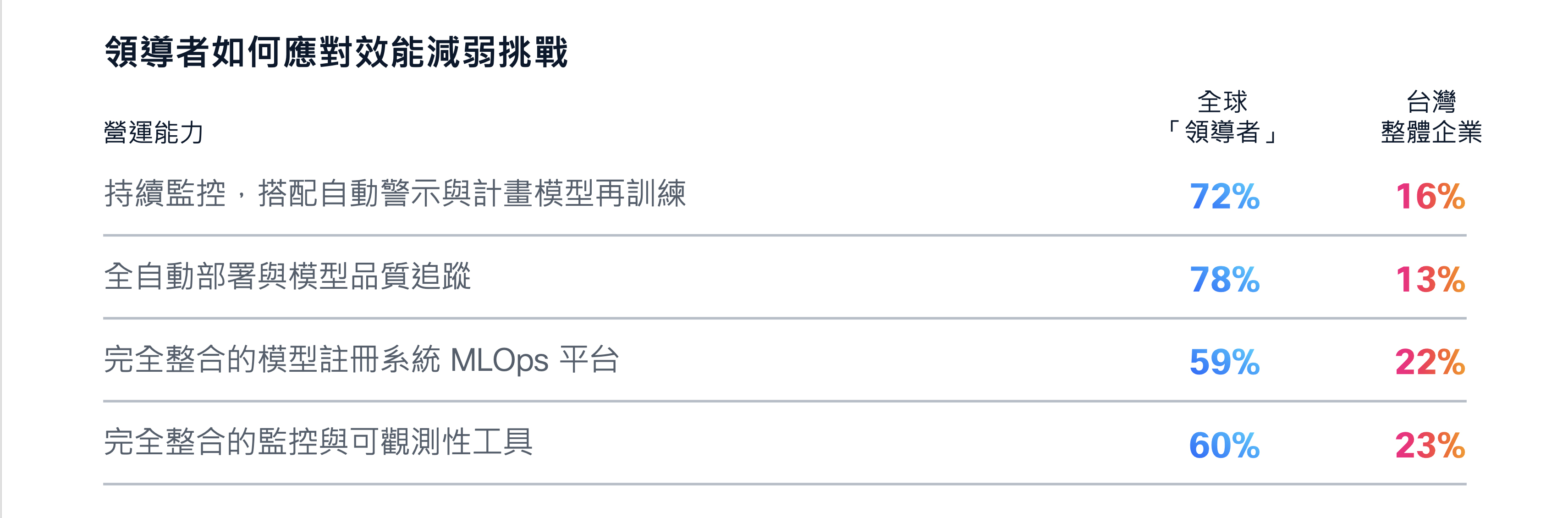 將AI模型正式應用於實際場景固然值得慶賀,但其效能可能隨時間逐漸減弱。領導者專注於部署後的持續優化,72%設有自動化再訓練機制的持續監控系統,遠高於台灣地區的16%。此舉大幅提升效率,65%領導者能在一小時內完成模型更新且幾乎無須停機(台灣整體企業數字僅為33%)。這種優勢會隨時間持續累積:優化速度快3至4倍的企業,每年可運行超過50次週期,遠超過一般企業12至15次的平均水平。領導者將部署視為起點,而非終點。