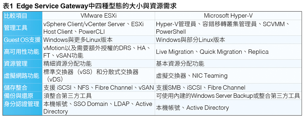 若需要使用到進階的虛擬化管理功能,像是VMware vSphere的DRS、FT以及整合vSAN等功能,那麼部署VMware vSphere架構中的ESXi與vCenter Server便是最佳選擇。不過,這樣的需求往往是在中大型以上的IT環境中才會使用到,一般中小企業的IT營運,通常只需要基礎的HA與vMotion功能即可滿足需求,而這樣的基礎需求只要部署Hyper-V叢集架構就可以輕鬆達到。VMware ESXi與Microsoft Hyper-V的比較,可參考表1的說明。