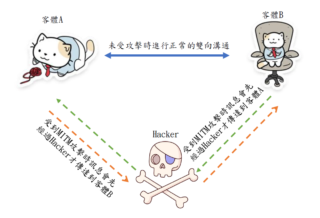中間人攻擊(MITM)是一種攻擊者藉由介入正在正常溝通的兩者間以達成特定目的的攻擊方式,透過將原本的二個端點的溝通行為,加上攻擊者於兩端點中間形成一個獨立端點,達到可以攔截、修改兩端點傳送的所有封包的目的,示意圖如圖1所示。