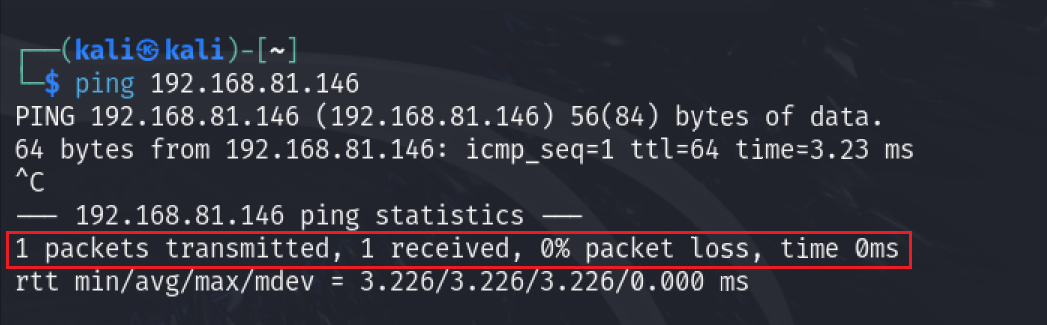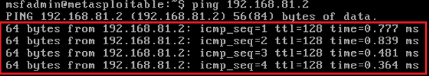 為了方便自行操作,同時避免攻擊到其他實際在運作的交換器而觸犯《妨害電腦使用罪》,以下使用Metasploitable2來模擬皮妥宿舍裡的老舊交換器,先在虛擬機上啟動Metasploitable2(帳號和密碼皆為msfadmin),接著使用ifconfig指令得知Metasploitable2的inet addr是192.168.81.146,然後開啟Kali Linux(其帳號密碼皆為kali)的Terminal輸入「ping 192.168.81.146」以確保Kali Linux與Metasploitable2可以互通(從圖5可以看出當Kali Linux在ping Metasploitable2時,封包能確實傳送與接收),其操作步驟如圖4與圖5所示。