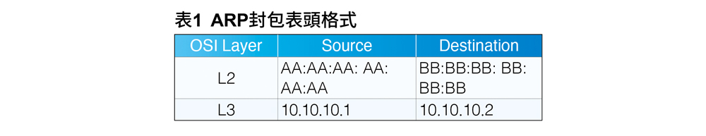 此時,PCA即可將目標IP對應的MAC位址寫入其ARP快取中,並建構資料封包的L2(資料鏈結層)與L3(網路層)表頭,準備傳送資料。封包表頭格式如表1所示。