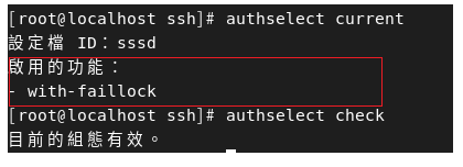 圖9 執行「authselect current」確認是否已啟用faillock。
