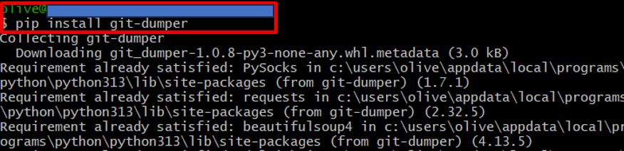 當所有必要檔案下載完成後,git-dumper會自動還原出原本的專案原始碼,讓攻擊者或研究人員可以直接用git指令操作。例如可以用git log檢視完整的提交歷史,甚至checkout各種分支,還原過去曾經出現過但後來被刪除的檔案。這種方法可以確認網站有無誤將完整開發歷史、密碼、API KEY或憑證等敏感資料外洩,使用python pip直接安裝git-dumper工具,指令如圖17所示,接著,使用指令「pip install -r requirements.txt」進行套件安裝。
