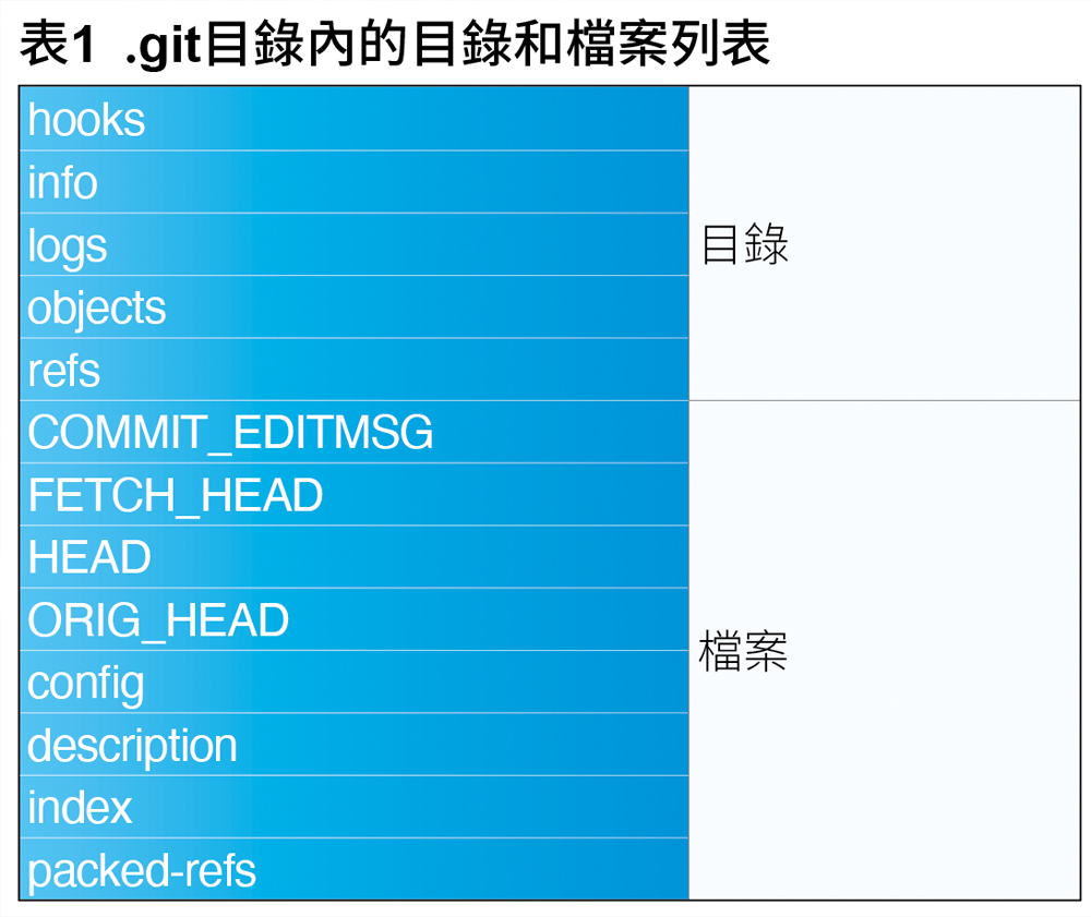 在Git系統中之所以能夠記錄使用者的行為,有一個隱藏資料夾扮演很重要的角色,它是「.git目錄」。在每一個專案資料夾中,在使用Git初始化專案後,會自動建立一個「.git」的隱藏目錄,如圖1為在Windows系統中的.git目錄。這個目錄中存放著所有版本控制所需的資料,是專案能夠回溯、切換與合併的關鍵檔案。也因此,只要保留.git目錄,即使刪除了其他檔案,也能完整還原整個專案的歷史版本。接著,介紹.git目錄內的檔案和目錄有哪些,整理如表1所示。