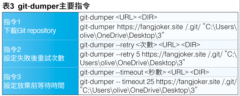 git-dumper主要指令整理如表3所示,其餘指令可以參考git-dumper的官方文件(https://github.com/arthaud/git-dumper)。例如,使用指令「git-dumper https://fangjoker.site/.git C:\Users\olive\OneDrive\Desktop\3」還原網站的.git目錄,如圖18所示。