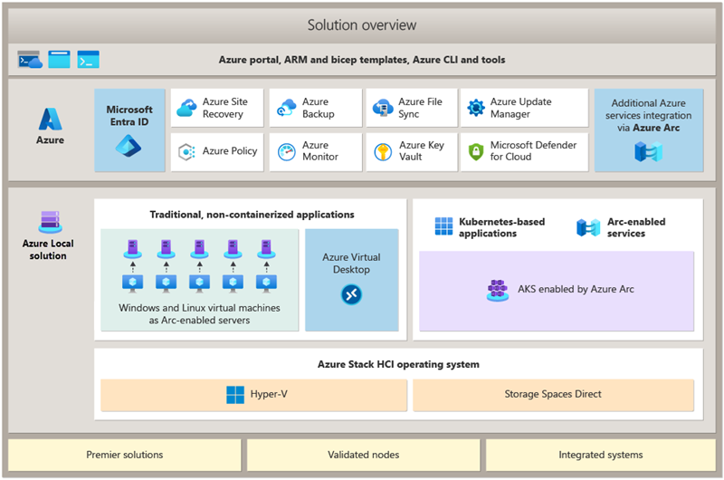 圖1 整合雲端與地端的Azure Local解決方案運作架構示意圖。 (圖片來源:Azure本機解決方案概觀 - Azure Local | Microsoft Learn)