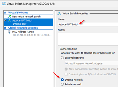 在本文實作環境中,建立的NAT vSwitch虛擬交換器名稱為「AzLocal-NATSwitch」,處理的NAT網路位址轉譯IP網段為「10.10.75.0/24」,預設閘道IP位址是「10.10.75.1」。
