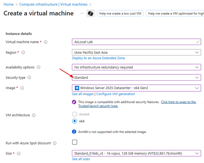 本次實作演練將會在Azure公有雲環境中部署一台支援巢狀式虛擬化的VM虛擬主機,接著建立多台巢狀式VM虛擬主機,達成部署Azure Local超融合叢集的目的。值得注意的是,在部署Azure VM Gen2世代虛擬主機時,預設在安全性類別採用「Trusted launch virtual machines」選項,雖然支援更多新式安全性機制,但是卻會造成巢狀式虛擬化機制無法運作。