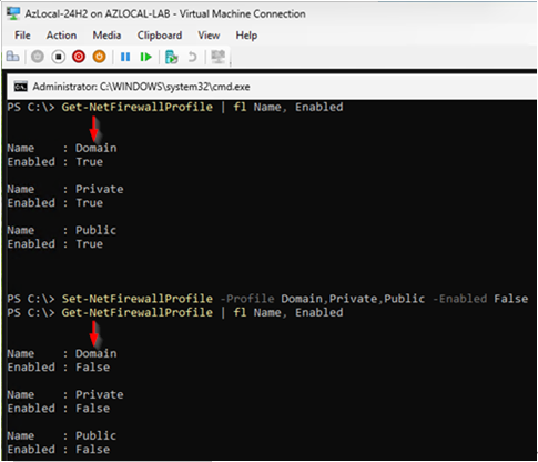 順利將Azure Local主機加入網域環境設定後,倘若管理人員對於指令管理防火牆規則不熟悉的話,可以在測試和研究環境中將防火牆關閉,在日後正式營運環境中務必保持防火牆規則啟用。執行指令「Set-NetFirewallProfile -Profile Domain,Private,Public -Enabled False」,一次將三個設定檔類型的防火牆規則都關閉,如圖11所示,然後再次確認是否套用生效。