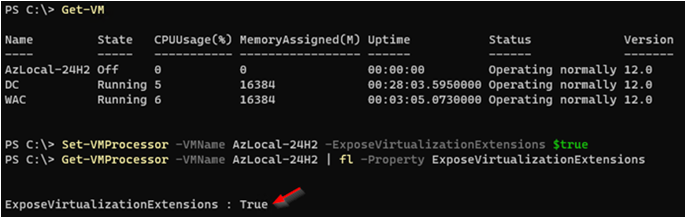 在建立Azure Local主機時,除了安裝OS作業系統硬碟之外,還額外配置6個1TB儲存空間的vDisk虛擬硬碟,屆時將整合為超融合儲存集區的儲存空間。在Azure Local主機處於關機狀態時,執行「Set-VMProcessor -VMName AzLocal-24H2 -ExposeVIrtualizationExtensions $true」指令,為Level 2層級的VM虛擬主機「AzLocal-24H2」啟用vCPU虛擬處理器硬體輔助虛擬化擴充功能,確保Azure Local主機能夠正確接收到底層Hyper-V虛擬化平台所公開和傳遞而來的Intel VT-x及EPT硬體輔助虛擬化技術。順利啟用後,請再次確認「ExposeVirtualizationExtensions」欄位值是否為「True」,確保啟用的工作任務已套用生效,如圖8所示。
