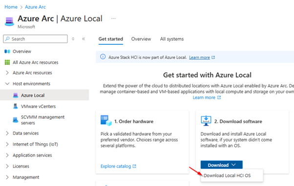 首先,分別下載Windows Server 2025和Windows11 ISO映像檔,以及最新版本的Azure Local 24H2映像檔。特別注意的是,Azure Local映像檔必須從Azure入口網站下載,在登入Azure Portal頁面中,於上方搜尋列中鍵入Azure Local關鍵字,進入Get started with Azure Local頁面後,於2. Download software區塊中點選Download Local HCI OS選項,如圖7所示,並選擇使用的Azure訂閱和Azure Local版本後,即可下載Azure Local映像檔。