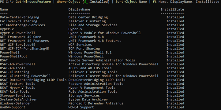 現在,最新版本的Azure Local 24H2已經將這些建構HCI超融合叢集環境時必要的伺服器角色和功能安裝完畢,所以管理人員只需要確認是否安裝完成即可。執行「Get-WindowsFeature」指令即可查詢,或是如圖13所示使用本文的指令,僅列出系統已經安裝的伺服器角色和功能,並且依照Name欄位的名稱進行排序以便更容易讀取結果。