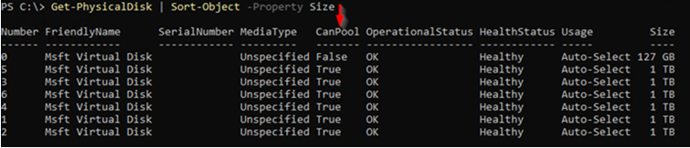 執行「Get-PhysicalDisk | Sort-Object -Property Size」指令,如圖12所示,檢查Azure Local主機儲存裝置,並以Size欄位排序顯示結果,確認6個1TB儲存空間的vDisk虛擬硬碟其每個CanPool欄位值皆為「True」,確保這6個儲存裝置都能順利加入至超融合儲存集區中。