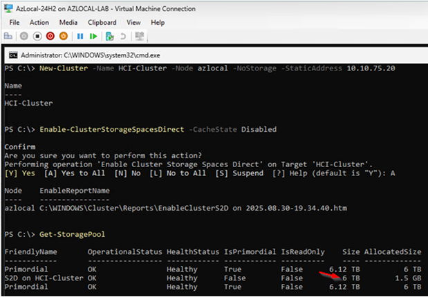 部署Azure Local超融合叢集的前置作業已經完成,管理人員可以使用PowerShell指令執行部署「單節點」超融合叢集的動作。執行「New-Cluster -Name HCI-Cluster -Node azlocal -NoStorage -StaticAddress 10.10.75.20」指令,建構叢集名稱為「HCI-Cluster」容錯移轉,叢集節點主機名稱為「azlocal」,容錯移轉叢集的IP位址為「10.10.75.20」。必須注意的是,因為採用巢狀式虛擬化技術的關係,所以必須再加上一個「-NoStorage」參數,如果是採用實體伺服器,則無須此參數。