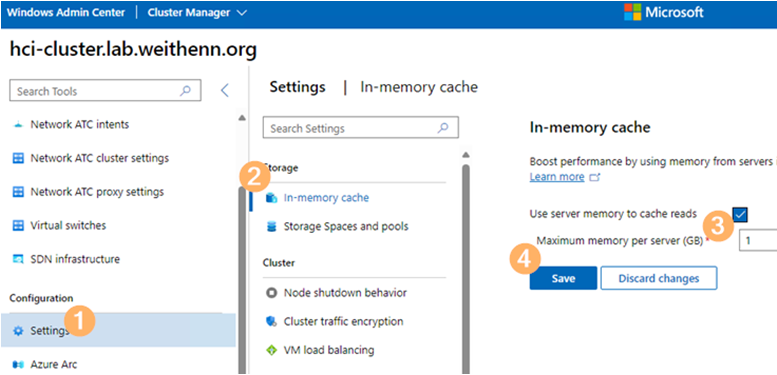 首先,依序點選「Configuration > Settings > Storage > In-memory cache」,進入CSV in-memory read cache功能設定頁面,簡單來說,這是將Azure Local節點主機的實體記憶體空間拿來當成VM虛擬主機的資料讀取快取空間,預設啟用並使用「1GB」記憶體空間,如圖17所示。