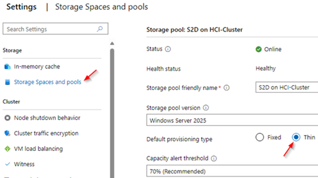 在儲存磁碟區方面,雖然Azure Local超融合叢集早已經全面支援精簡佈建磁碟區,但在預設情況下,系統預設值仍為「固定」(Fixed)磁碟區。因此,管理人員可以在建立磁碟區之前,在WAC管理介面中先依序點選「Configuration > Settings > Storage > Storage Spaces and pools > Storage Pool : S2D on HCI-Cluster > Default Provisioning Type」,再將預設值Fixed選項調整為「Thin」選項,按下〔Save〕鈕,將磁碟區預設值修改為採用精簡佈建磁碟區,如圖18所示。