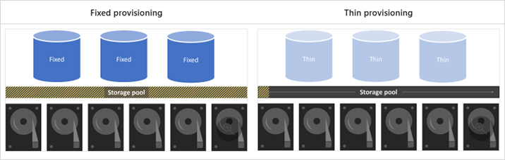 圖20 固定磁碟區和精簡佈建磁碟區的比較。 (圖片來源:Azure本地23H2版中的儲存精簡配置-Azure Local | Microsoft Learn)