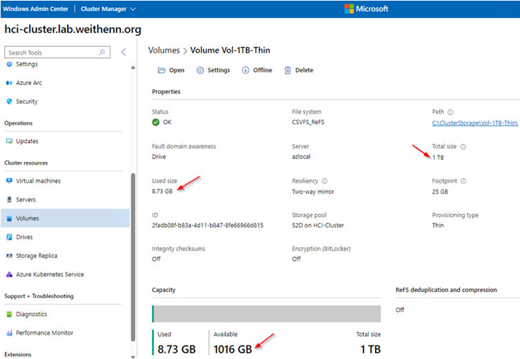 從Azure Local 2311.2版本開始,便新增支援「精簡佈建磁碟區」(Thin Provisioning)功能。簡單來說,當管理人員不確定需要多少磁碟空間,並且對於儲存效能相較於固定磁碟區差一點時,便可以建立精簡佈建磁碟區來使用,進而達到節省儲存空間的目的,如圖20所示,詳細資訊請參考「Storage thin provisioning in Azure Local, version 23H2 - Azure Local | Microsoft Learn」文件內容。