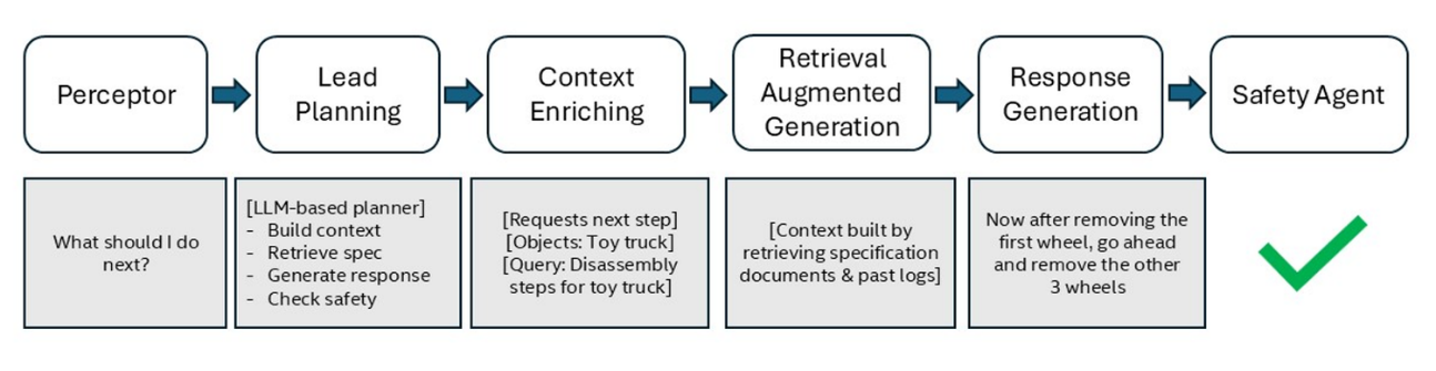 多代理流程(Multi-agent Pipeline)是一種精密的架構,將感知(Perception)、規劃(Planning)以及行動(Action)代理組合成一個LLM團隊。這個系統能夠處理各種任務並利用外部資源,例如解讀多模態和視覺輸入、檢查相關文件,甚至能夠透過指定的代理檢查回應的安全性。CoT推理可闡明這些代理,並促使每個代理解釋它對這條推理鏈中的下一個代理「說了什麼」。