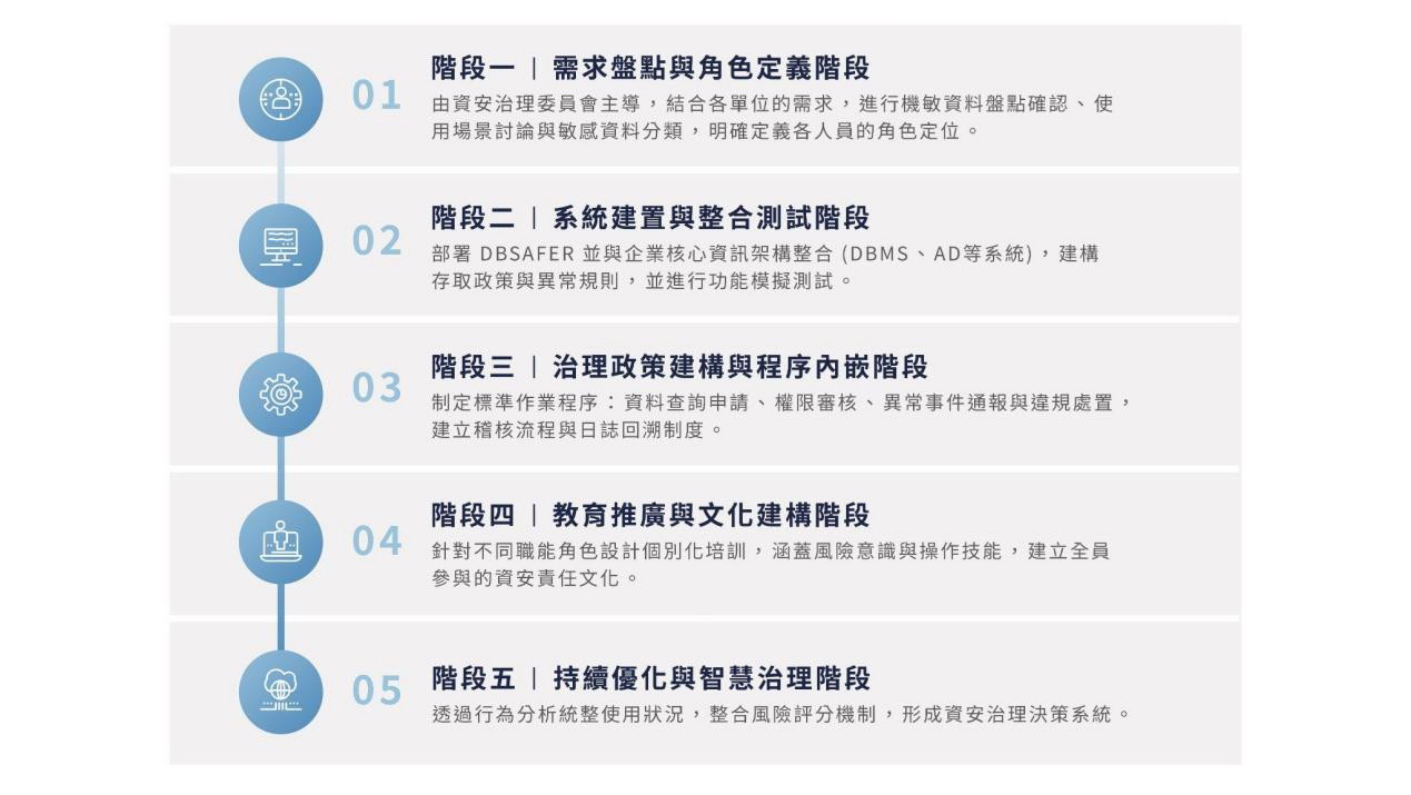 在全球法規日益趨嚴與資安威脅層出不窮的雙重壓力下,企業若欲在確保資料庫安全的同時符合法規要求,必須從制度、技術與文化等多層面同步展開。特別是在資料治理已成為企業核心治理架構的重要一環之際,導入專業平台,已不再是單純的技術選擇,更是策略與治理布局的關鍵。為確保其在企業環境中發揮最大效益,圖4中的五大階段導入模型提供系統性參考,協助組織自需求盤點邁向智慧治理,建立具彈性且可持續之資安治理體系。