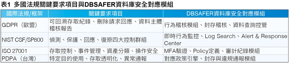 在數位治理日趨嚴格的當代環境中,資訊安全已不僅是技術層面的防護議題,更是各國法規遵循的核心要求。從歐盟的GDPR、台灣的PDPA,到國際間廣泛應用的NIST框架與ISO標準,皆強調對個人資料與企業關鍵資訊的保護、稽核與透明性。這些法規要求企業不僅須掌握資料存取的「誰、何時、為何」等紀錄,亦須建立即時通報、異常偵測與回應機制。DBSAFER正是在這樣的治理背景下,提供全方位的對應模組,協助企業在多國法規壓力下建立穩健、可稽核且具備持續改進能力的資安治理架構,其對應關鍵項目介紹見表1所述。