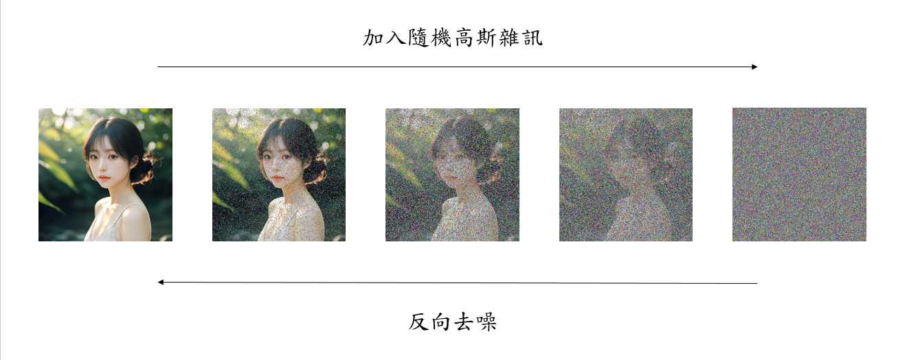 擴散模型(Diffusion Model)屬於生成式人工智慧(Generative AI)中一種重要的架構,其核心思想為:先將「真實數據」(例如一張圖像)逐漸加入隨機高斯雜訊(Forward Diffusion),直到圖像變成近似純雜訊;接著模型學習如何從這樣的雜訊中反向去噪(Reverse Diffusion),最終恢復出清晰的圖像(圖1)。在Stable Diffusion中,這樣的過程被用於從「隨機雜訊」生成與「文字描述」相對應的圖像。