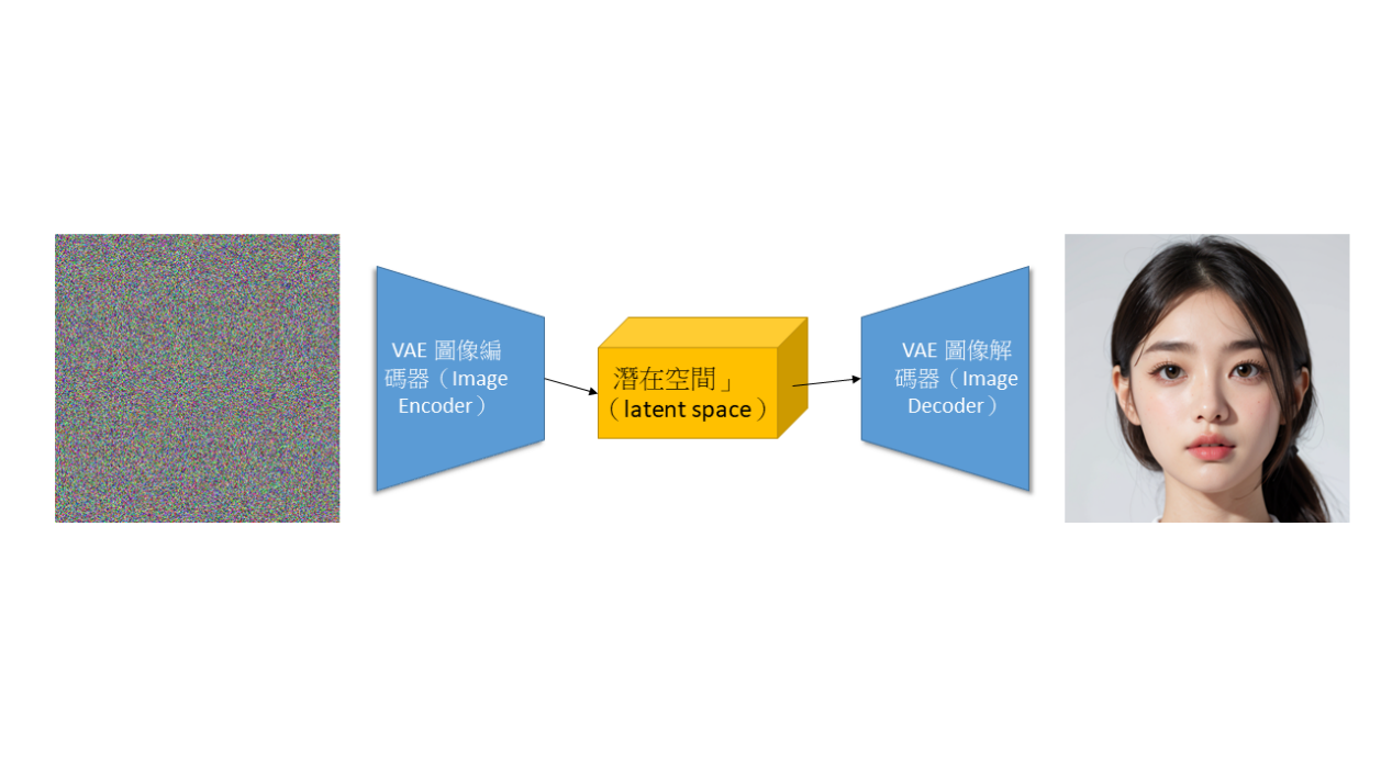 簡單來說,就是先把圖片轉換成一組「簡化後的數據」,也就是所謂的潛在向量,就像把一張高清照片變成縮圖,雖然人眼看不見細節,但AI還是能夠理解畫面的大致形狀、顏色與構圖。接著,就在這個簡化後的空間中進行雜訊擴散與去噪,最後再由解碼器還原成一張完整的圖片。這個壓縮與還原的過程是由一種稱為「變分自編碼器(VAE)」的模型負責,其主要目的是為了節省運算資源、能結合多種條件生成、使一般電腦也能運行(圖2)。