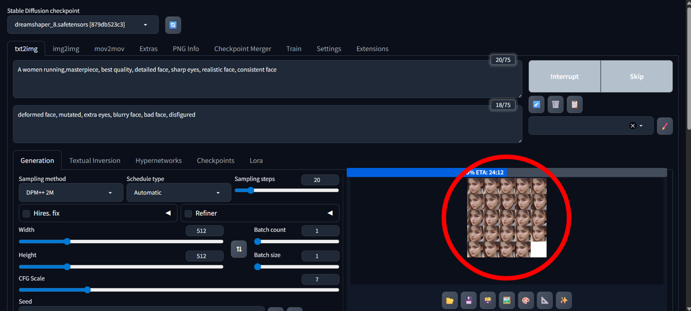此時,就可開始進行影片的生成。首先,在Prompt欄位內輸入想要呈現的畫面及動作,可輸入想要呈現或加強的細節,例如細緻的臉部(Detailed Face)。接著,在Negavite Prompt欄位內輸入不想出現在畫面中的元素,例如多餘的眼睛(Extra Eyes)。若是像小周這樣第一次接觸AI生成影片的初學者,可以下載其他作者已訓練完成的模型檔,並從Civitai網站複製範例的Prompt(圖8)。