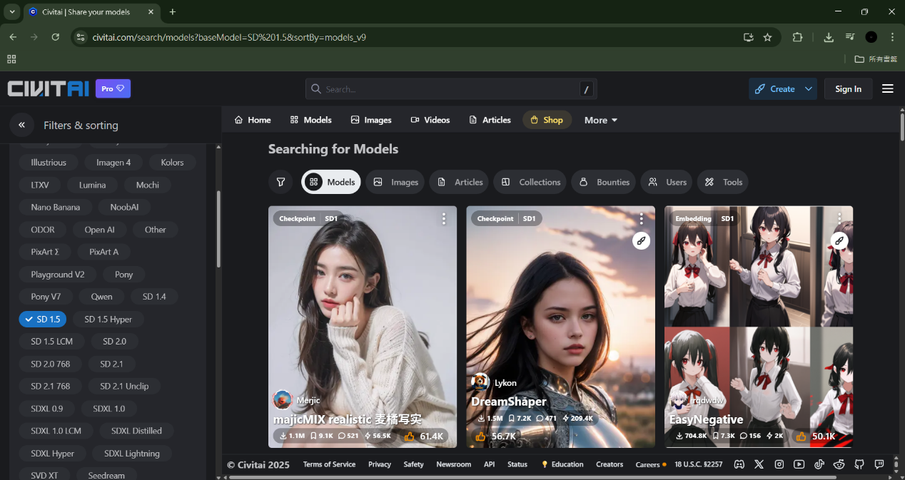 完成之後,將會出現資料夾「Stable-Diffusion-Webui」。再來,上網選擇模型檔並放置在資料夾中。Stable Diffusion本體模型不包含在WebUI中,須手動放入。可至Hugging Face或Civitai(圖4)下載模型,然後放入models資料夾(依模型版本不同而異)。