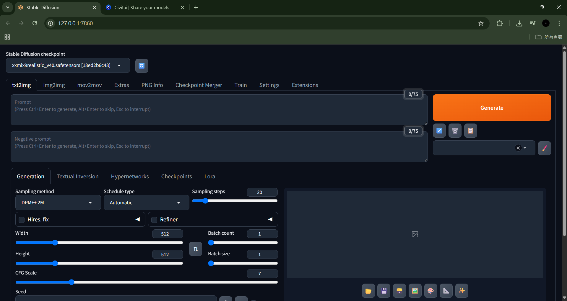 安裝完畢後會跳出Stable Diffusion WebUI頁面(圖5),或是出現類似以下的訊息「Running on local URL: http://127.0.0.1:7860」,在瀏覽器中輸入該網址,即可進入WebUI介面,此時就可操作圖片的生成。