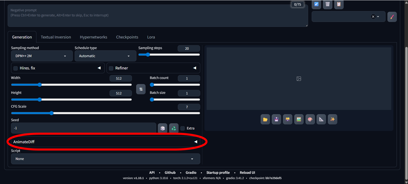 ‧Enable AnimateDiff(啟用動畫生成):打勾後才會使用AnimateDiff生成影片,而非靜態圖片。