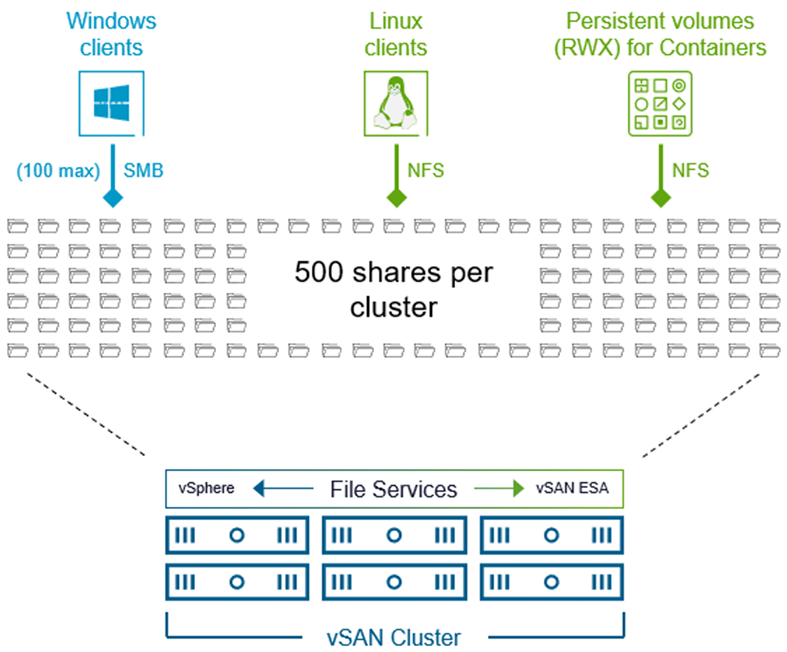 圖2 每個vSAN叢集中的vSAN檔案服務,最多支援500個檔案分享。 (圖片來源:Enhancements with vSAN File Services in VMware Cloud Foundation 9.0 - VMware Cloud Foundation(VCF)Blog)