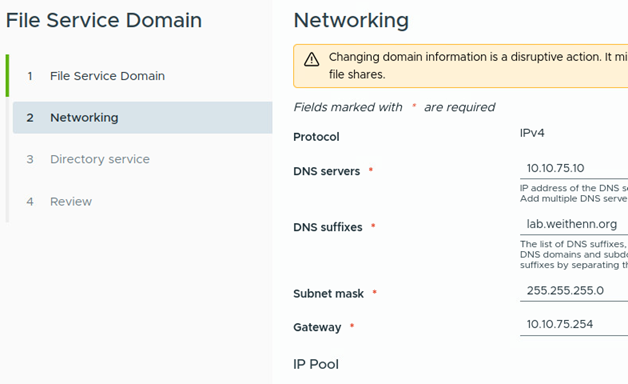 在2. Network選項中,依序填入DNS伺服器IP位址、DNS尾碼、子網路遮罩、預設閘道IP位址,例如本文實作環境依序為10.10.75.10、lab.weithenn.org、255.255.255.0、10.10.75.254,如圖3所示。接著,往下捲到IP Pool區塊內,將規劃用於vSAN叢集節點主機的主機名稱和IP位址,條列於IP Pool當中,例如10.10.75.31、vsan-01b.fs.lab.weithenn.org等等依序填入。