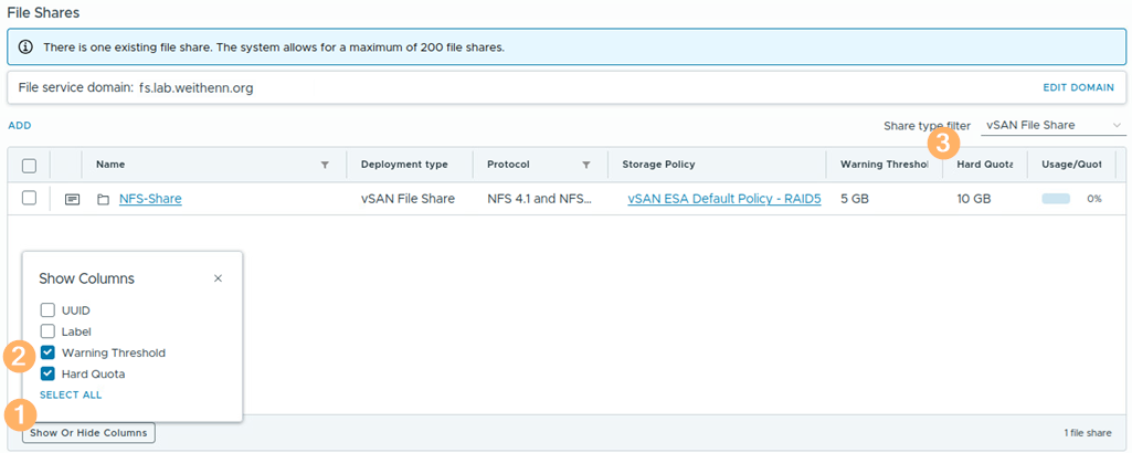 每個vSAN叢集中的vSAN檔案服務,最多支援500個檔案分享,如圖2所示,這樣的數量足以滿足大多數情境需求,無論是Linux或Windows運作環境的需求,以及需要NFS-based Persistent Volumes機制,提供持續性儲存的雲端原生工作負載環境。值得注意的是,SMB分享機制仍存在最多100個SMB分享的上限。