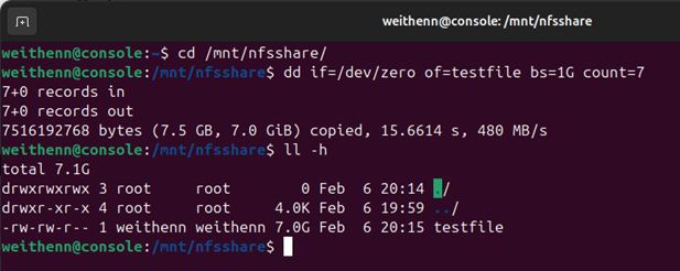 現在可以開始測試Linux主機是否能夠讀寫檔案至NFS檔案共用路徑中。切換至「/mnt/nfsshare」本機掛載點路徑,執行「dd if=/dev/zero of=testfile bs=1G count=7」指令,寫入一個檔案名稱為「testfile」、大小為7GB的測試檔案,然後執行「ll -h」指令確認檔案是否建立成功,如圖11所示。