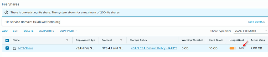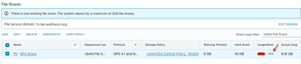 雖然在NFS檔案共用組態設定頁面中,可以看到個別的儲存空間占用資訊,然而依照目前每個vSAN叢集最大支援500個NFS檔案共用項目來看,若想要知道整體NFS檔案共用機制總共占用vSAN叢集多少儲存空間,除了一筆一筆計算之外,有沒有更好的方法?