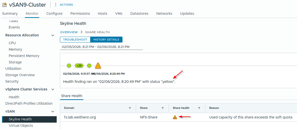 當然,在企業組織的營運環境中,管理人員不可能時時去查看每個NFS檔案共用的使用者情況,所以預設情況下,vSAN Skyline Health健康檢查機制每隔一段時間便會檢查使用情況。現在,可以立即觸發檢查作業進行驗證,在vCenter管理介面中,依序點選「Cluster > Monitor > vSAN > Skyline Health > RETEST」,讓系統立即執行系統健康情況檢查工作程序。檢查完成之後,再次查看vSAN檔案共用三大系統服務時,便會發現其中的「Share Health」服務,狀態由先前的Healthy變更為Yellow (Warning)狀態,並且說明理由是儲存空間已經達到Quota門檻值,如圖15所示。