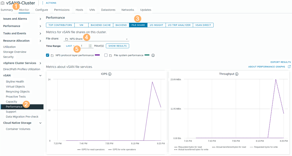 在vCenter管理介面中,依序點選「Cluster > Monitor > vSAN > Performance > File Share」,在File Share下拉式選單中選擇要觀察執行效能的NFS檔案共用名稱,例如NFS-Share,即可看到各項執行效能資料,預設情況下為顯示最近1小時的效能資訊,也可以視需求調整觀察的時間區段,如圖17所示。