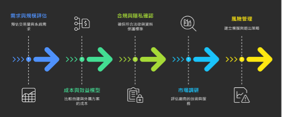 第一步是需求與規模評估:預估短中長期交易量與系統需求的複雜度,包括簽核層級、法遵規範與跨境監理要求。